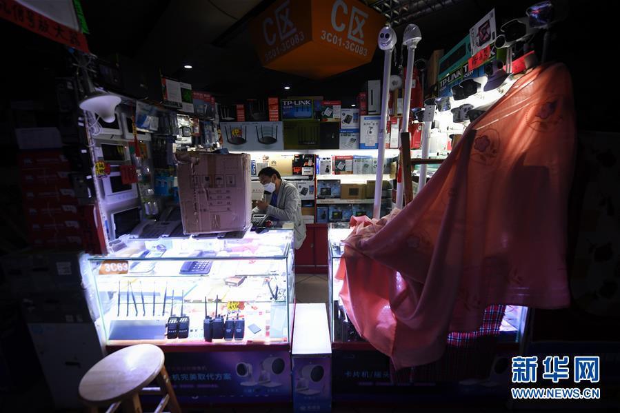 2月24日,在深圳華強(qiáng)北暫未完全開放的賽格電子市場(chǎng)里,商戶在與客戶打電話。 新華社記者 毛思倩 攝