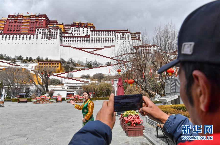 3月1日,布達拉宮管理處講解員次仁卓嘎(右)在進行直播。新華社記者春拉攝