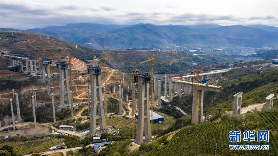 這是3月5日拍攝的中老鐵路南溪河特大橋橫跨在建高速公路(無人機(jī)照片)。近期,中老鐵路玉溪至磨憨段有序復(fù)工復(fù)產(chǎn),由中鐵四局承建的中老鐵路全線重點控制性工程——元江特大橋、南溪河特大橋正在加緊施工建設(shè)。新華社記者 江文耀 攝