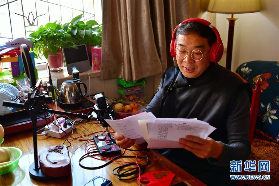 武凌云在直播中為戲迷講解劇本的創(chuàng)作過程(3月5日攝)。 新華社記者 曹陽 攝