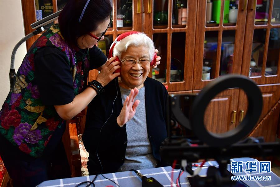 閻惠貞(右)在和直播平臺(tái)的戲迷打招呼(3月6日攝)。 新華社記者 曹陽(yáng) 攝