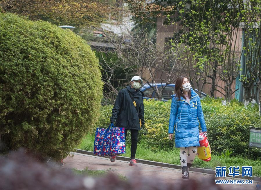 3月12日,小區(qū)樹葉綠了,黎婧(右)與網格員走在回家路上。 3月12日,插畫師黎婧和84位病友離開自己居住的武漢軟件工程職業(yè)學院康復驛站,回到自己家中。他們都是治愈出院的新冠病毒肺炎患者,已經在武漢軟件工程職業(yè)學院康復驛站進行了14天醫(yī)學觀察,達到醫(yī)學標準,成功解除隔離。他們由專車運送至所屬社區(qū)附近的集散點后,在社區(qū)工作人員的陪同下回家。 新華社記者 肖藝九 攝