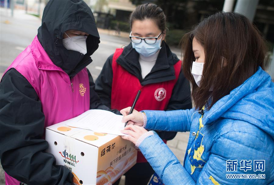 3月12日,小區(qū)工作人員為黎婧(右)準備了一箱臍橙。 3月12日,插畫師黎婧和84位病友離開自己居住的武漢軟件工程職業(yè)學院康復驛站,回到自己家中。他們都是治愈出院的新冠病毒肺炎患者,已經在武漢軟件工程職業(yè)學院康復驛站進行了14天醫(yī)學觀察,達到醫(yī)學標準,成功解除隔離。他們由專車運送至所屬社區(qū)附近的集散點后,在社區(qū)工作人員的陪同下回家。 新華社記者 肖藝九 攝