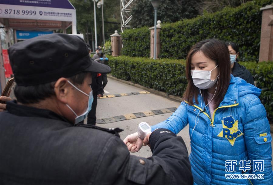 3月12日,小區(qū)安保人員對黎婧進行體溫檢測。 3月12日,插畫師黎婧和84位病友離開自己居住的武漢軟件工程職業(yè)學院康復驛站,回到自己家中。他們都是治愈出院的新冠病毒肺炎患者,已經在武漢軟件工程職業(yè)學院康復驛站進行了14天醫(yī)學觀察,達到醫(yī)學標準,成功解除隔離。他們由專車運送至所屬社區(qū)附近的集散點后,在社區(qū)工作人員的陪同下回家。 新華社記者 肖藝九 攝