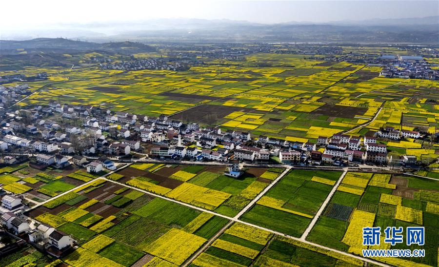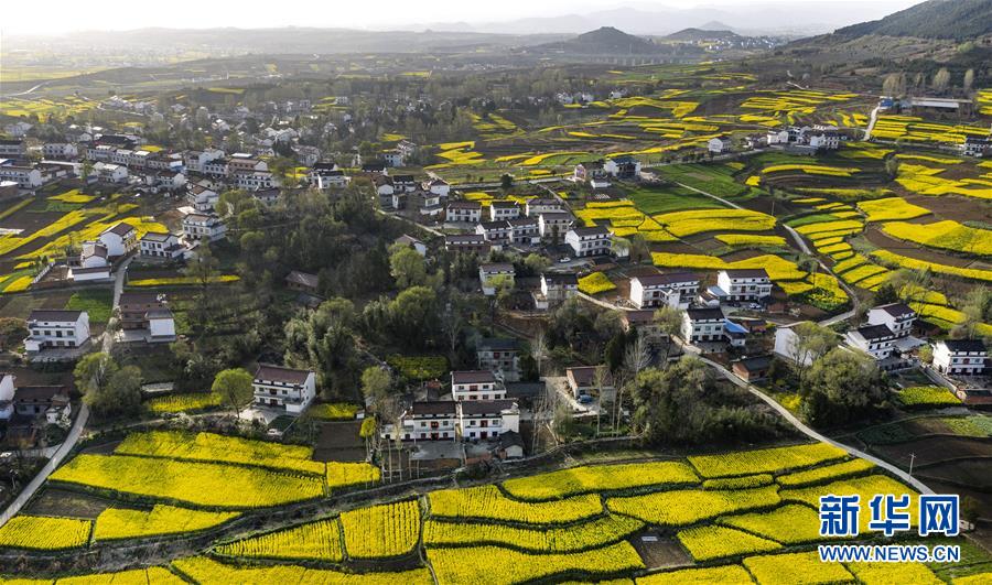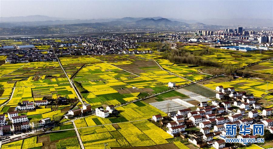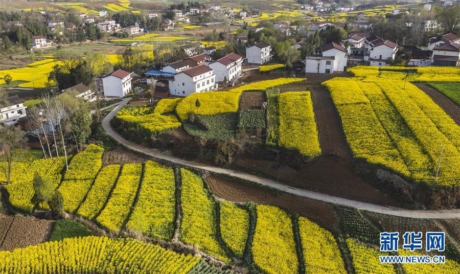 3月14日,洋縣龍亭鎮(zhèn)柳山村盛開的油菜花與村舍構(gòu)成美麗的圖畫(無人機照片)。  新華社記者陶明攝