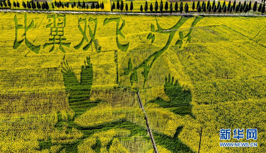 3月14日拍攝的洋縣紙坊街道龍山觀花點創(chuàng)意種植的“相守一生”油菜花景觀(無人機照片)。  新華社記者陶明攝