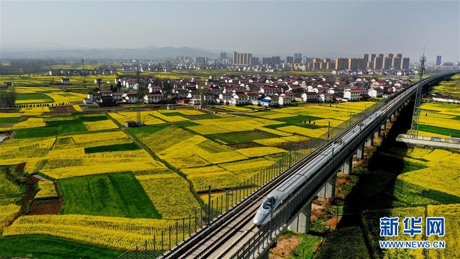 3月14日,一列動車從洋縣油菜花海中駛過(無人機照片)。  新華社記者陶明攝