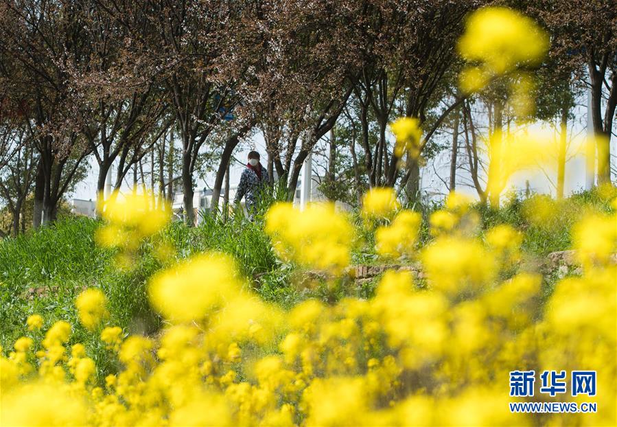 3月14日,在武漢市西北部市郊,一名市民從油菜花田前走過。隨著氣溫升高,春意在武漢的枝頭上萌動(dòng),花朵漸次開放。新華社記者肖藝九攝