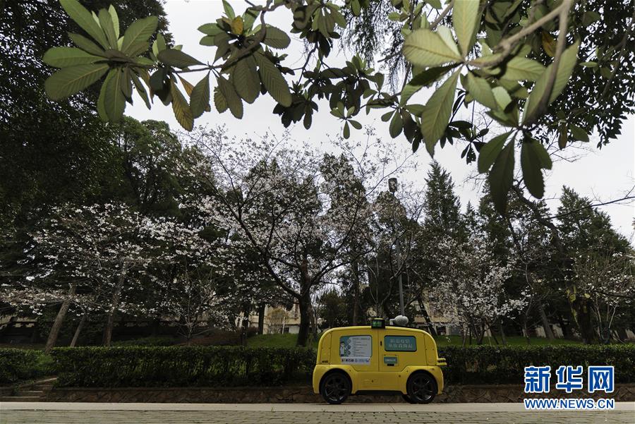 一輛5G無(wú)人攝像車(chē)在武漢大學(xué)櫻花大道進(jìn)行不間斷無(wú)人巡游,實(shí)時(shí)采集和傳輸直播圖像信號(hào)(3月16日攝)。新華社記者費(fèi)茂華攝