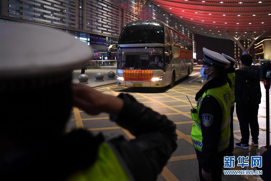 3月17日,抵達(dá)湖南長沙南站的醫(yī)療隊(duì)隊(duì)員乘坐大巴離開。新華社記者薛宇舸攝
