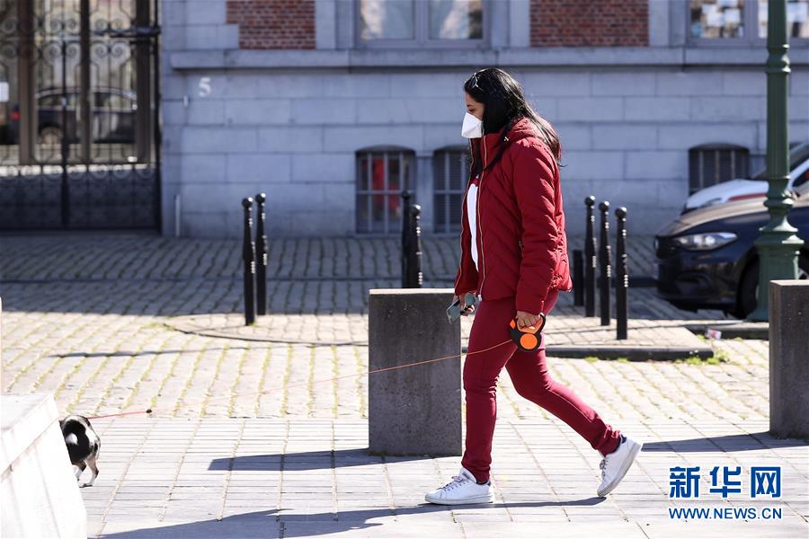 3月18日,在比利時(shí)布魯塞爾,一名佩戴口罩的女子在遛狗。 新華社記者 張鋮 攝