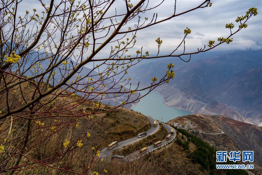 搬家的車隊(duì)行駛在金沙江畔的盤山公路上,江對岸是四川省金陽縣(3月15日攝)。 新華社記者 江文耀 攝