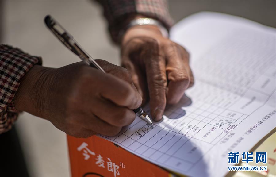 抵達(dá)魯?shù)榭h卯家灣易地扶貧安置區(qū)的王大香在領(lǐng)取新家鑰匙的名冊上簽下丈夫的名字(3月15日攝)。 新華社記者 江文耀 攝
