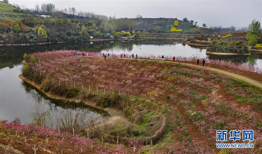 3月22日,游人在柳山湖的桃花島上游覽(無人機照片)。陽春三月,陜西省漢中市洋縣龍亭鎮(zhèn)柳山村,1300畝桃園的花朵綻放。新華社記者陶明攝