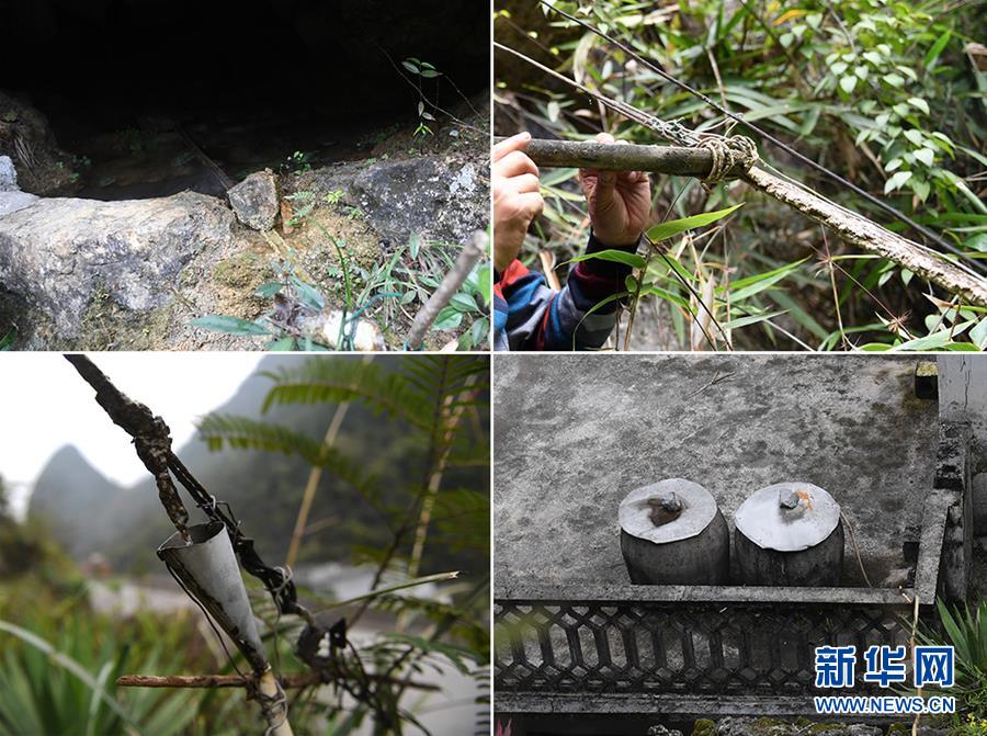 這張拼版圖片顯示廣西都安瑤族自治縣澄江鎮(zhèn)自成村加倫屯村民黃景飛獨(dú)創(chuàng)的“鐵線引水”法(2018年3月16日攝)。左上圖為竹枧將山泉水從山洞引出;右上圖為竹枧將山泉水引到鐵線上;左下圖為一個(gè)特制的漏斗將水接入膠管里;右下圖為膠管將山泉水送到水缸里。廣西有近一半貧困人口生活在石漠化地區(qū),涉及數(shù)十個(gè)縣區(qū)。這里也是廣西飲水保障程度最低的地區(qū),解決貧困人口飲水問題是廣西脫貧攻堅(jiān)戰(zhàn)“硬仗中的硬仗”?!笆濉币詠?,廣西加快實(shí)施農(nóng)村飲水安全鞏固提升工程。因地制宜,采取新建、擴(kuò)建及管網(wǎng)延伸等多種措施,補(bǔ)齊貧困地區(qū)水利薄弱短板,進(jìn)一步提升石漠化地區(qū)群眾飲水安全保障水平,助推脫貧攻堅(jiān)。新華社記者陸波岸攝