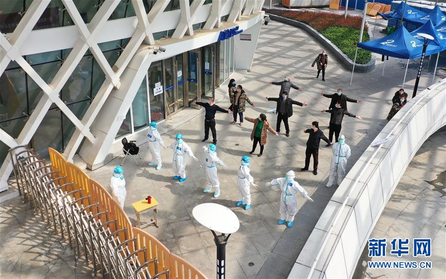 3月10日,在武漢江夏方艙醫(yī)院,醫(yī)護(hù)人員教患者練習(xí)八段錦(無人機(jī)照片)。新華社記者才揚(yáng)攝