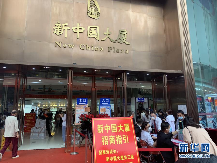 在廣州市新中國(guó)大廈門口,顧客排隊(duì)進(jìn)行安全檢查(3月21日攝)。新華社記者周穎攝