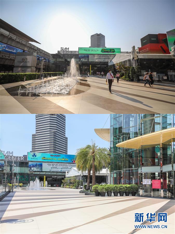 這是3月21日拍攝的泰國曼谷暹羅廣場(上圖)和3月22日拍攝的空無一人的廣場的對比圖。新華社記者張可任攝