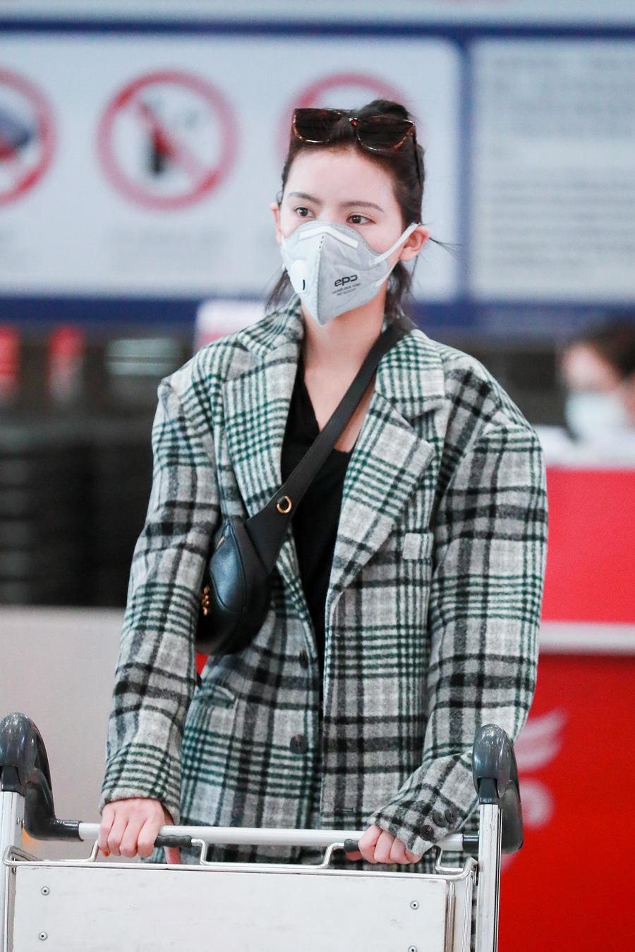 張予曦扎丸子頭穿格子西裝又美又颯 搭配斜挎小包潮范十足