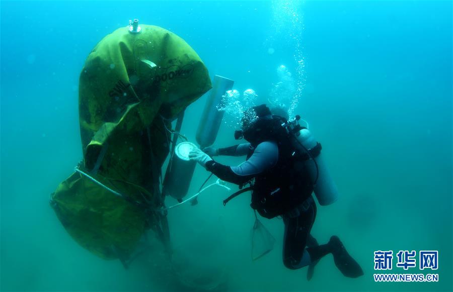 在位于海南三亞蜈支洲島旅游區(qū)的海洋牧場(chǎng),工作人員在為浮力袋充氣后,浮力袋帶著固定好的人工魚(yú)礁上浮(3月27日攝)。近日,位于海南三亞蜈支洲島旅游區(qū)的海洋牧場(chǎng)復(fù)工,海底作業(yè)逐漸恢復(fù)正常,開(kāi)始進(jìn)行人工魚(yú)礁吊裝擺位、水下監(jiān)控清理以及日常巡護(hù)等工作。據(jù)介紹,人工魚(yú)礁有利于魚(yú)類(lèi)種類(lèi)增加和數(shù)量提高,蜈支洲島海域海洋牧場(chǎng)人工魚(yú)礁表面附著珊瑚、貝類(lèi)、藻類(lèi)等生物種類(lèi)達(dá)120余種。新華社記者楊冠宇攝