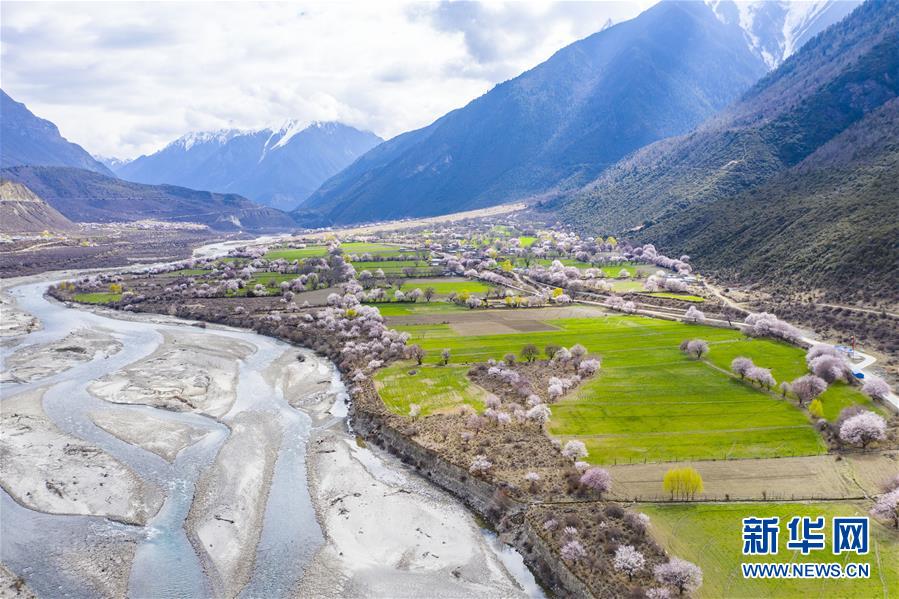 西藏林芝市波密縣境內(nèi)桃花盛開的田園風(fēng)光(無人機(jī)照片,3月26日攝)。新華社記者 晉美多吉 攝
