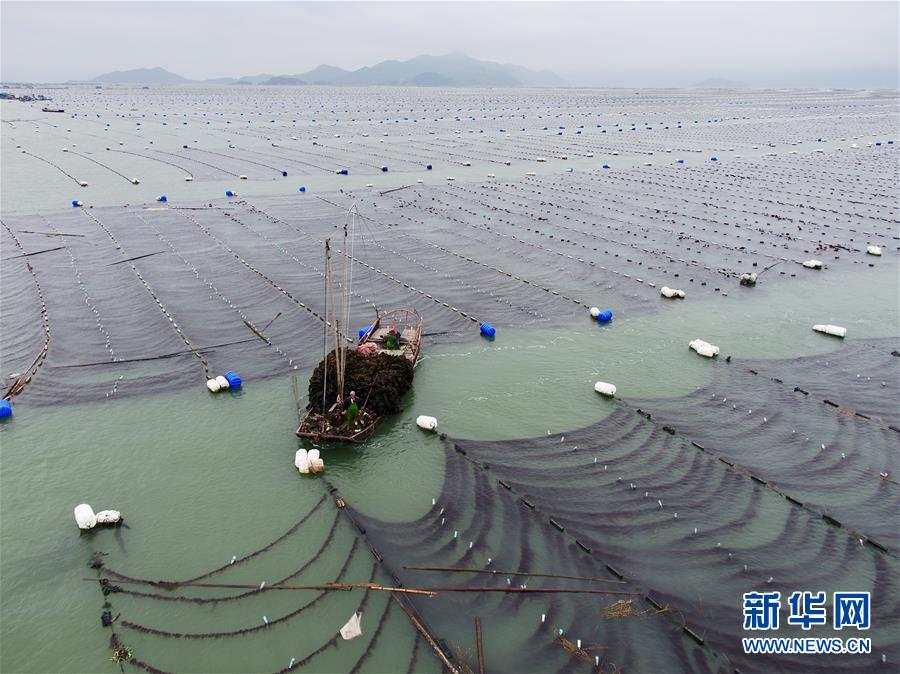 4月10日,霞浦縣長春鎮(zhèn)海域,海帶養(yǎng)殖戶在用船只運(yùn)輸海帶(無人機(jī)拍攝)。新華社記者姜克紅攝