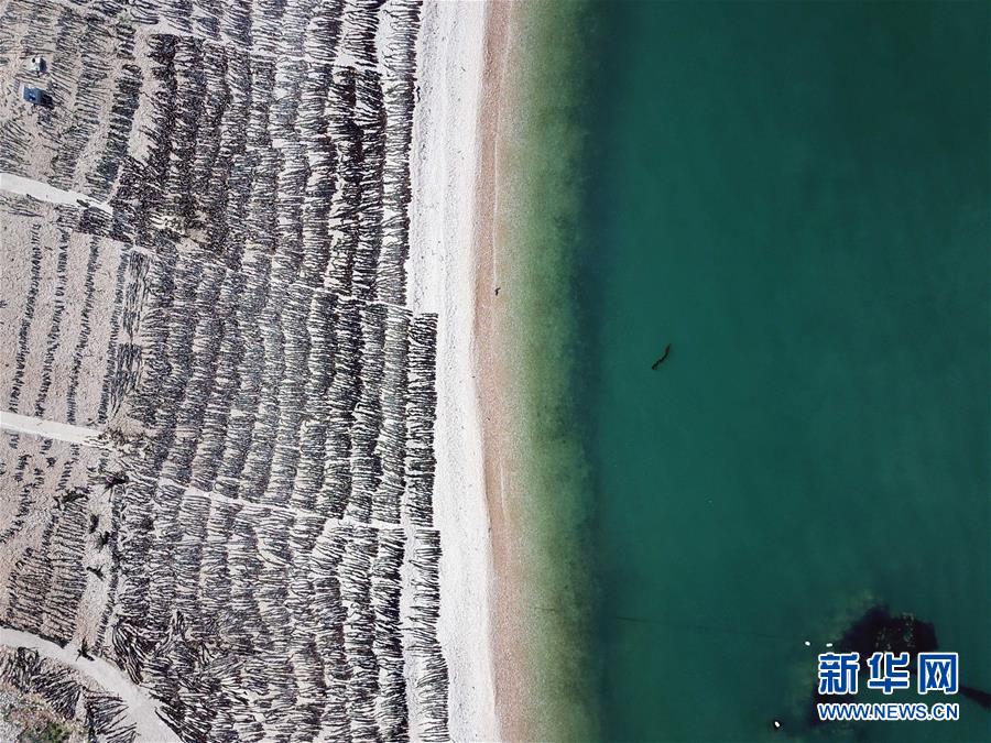 這是大欽島鄉(xiāng)東村海灘晾曬的海帶(5月23日無人機(jī)拍攝)。新華社記者朱崢攝