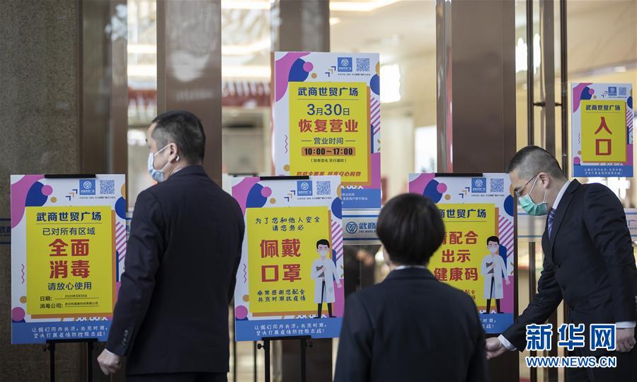 3月30日,在武商世貿(mào)廣場(chǎng),工作人員歡迎顧客進(jìn)入。當(dāng)日,武漢市多家商場(chǎng)開門迎客。新華社記者費(fèi)茂華攝
