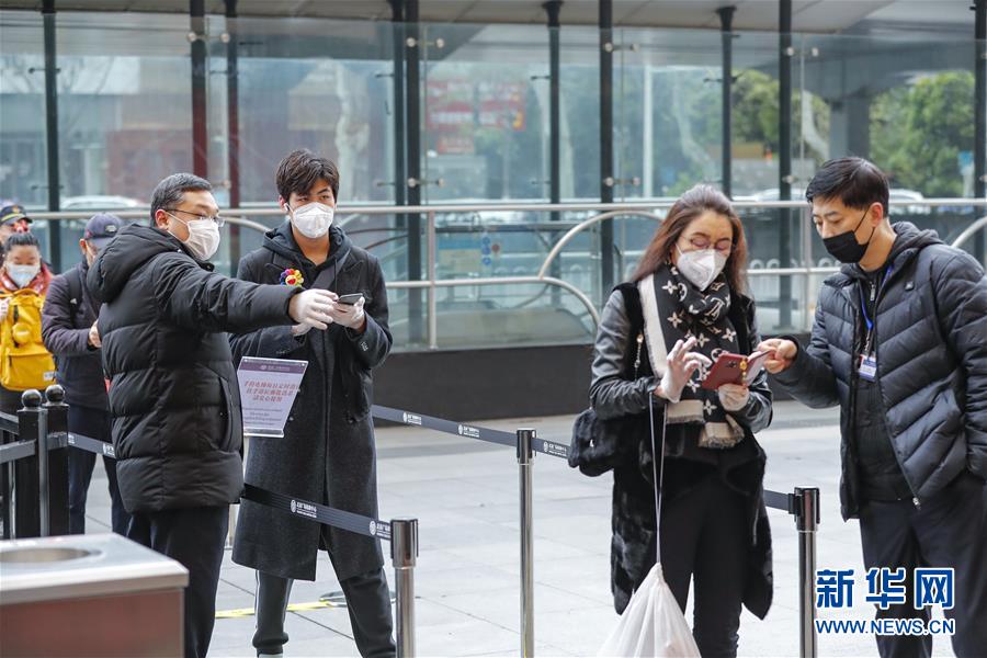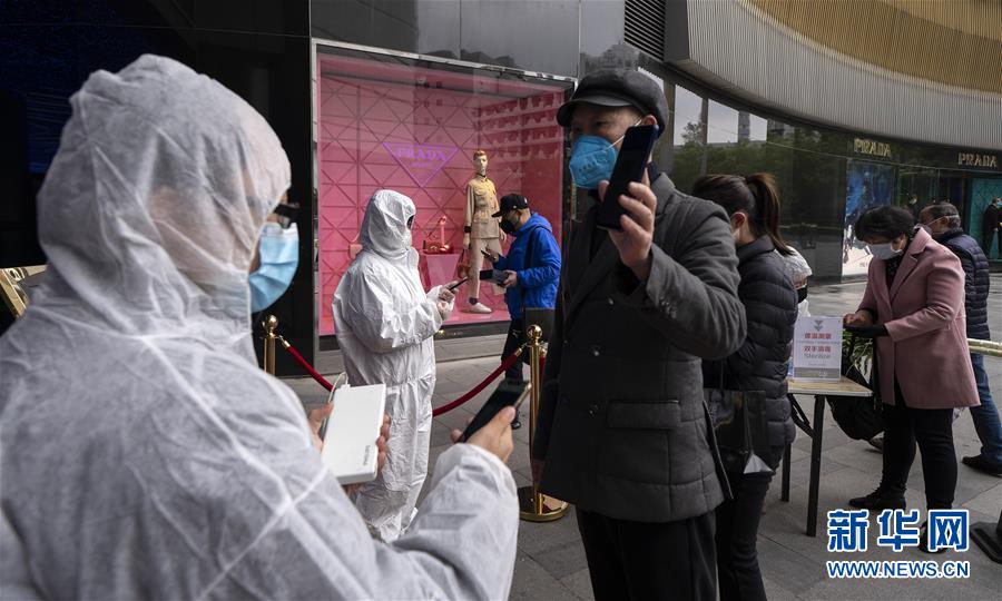 3月30日,在武漢市武商廣場(chǎng)外,人們?cè)诠ぷ魅藛T指引下,用手機(jī)掃描健康碼后進(jìn)入商場(chǎng)購物。當(dāng)日,武漢市多家商場(chǎng)開門迎客。新華社記者沈伯韓攝