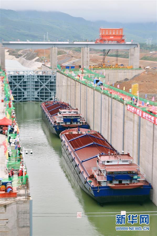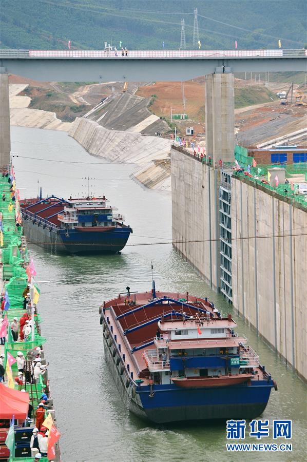 3月31日,船只駛?cè)氪筇賺{水利樞紐工程船閘閘室。新華社記者崔博文攝