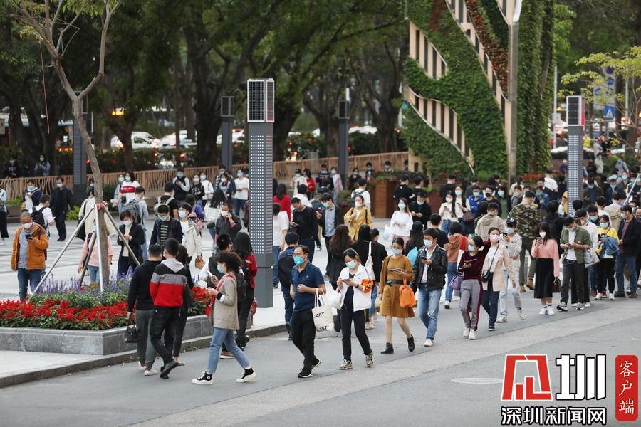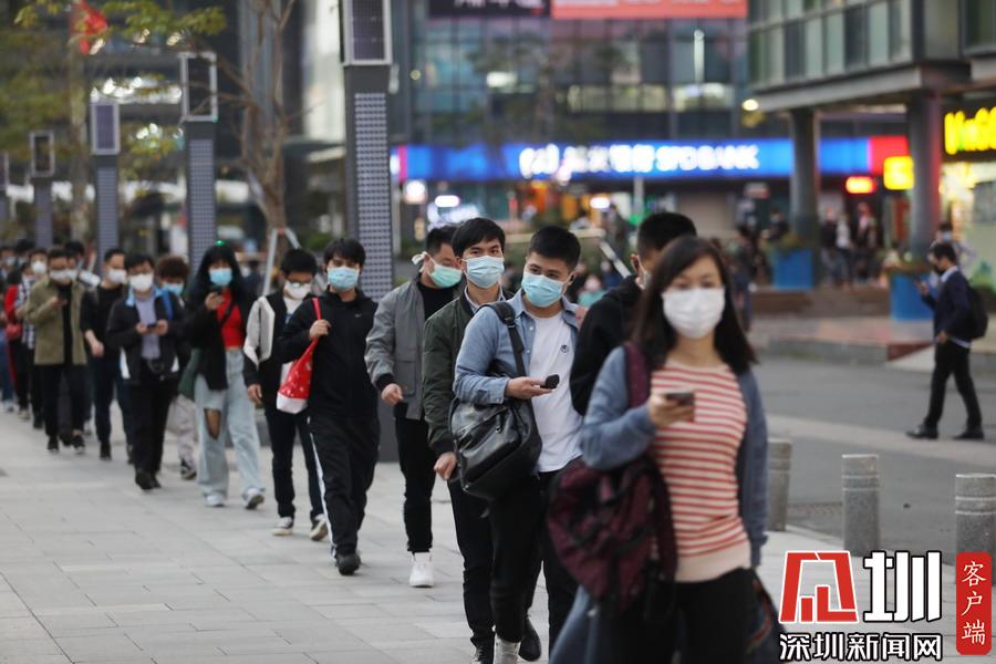 見圳客戶端·深圳新聞網(wǎng)2020年3月19日訊 下班時間,深圳地鐵一號線深大站A3出口外,下班后的市民在站外排大排長龍,依次有序進入地鐵站乘坐列車回家。