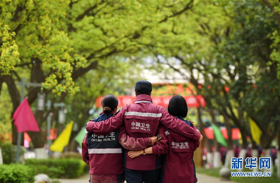 4月3日,陜西省第一批援鄂醫(yī)療隊(duì)隊(duì)長(zhǎng)易智(中)安慰離別的隊(duì)員。 當(dāng)日,陜西省第一批援鄂醫(yī)療隊(duì)137名隊(duì)員在陜西省工人療養(yǎng)院結(jié)束了為期兩周的隔離休養(yǎng)。醫(yī)療隊(duì)員與“戰(zhàn)友”深情作別后,陸續(xù)踏上歸途。 新華社記者 李一博 攝