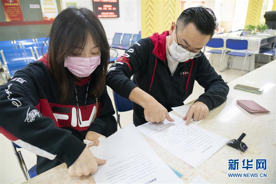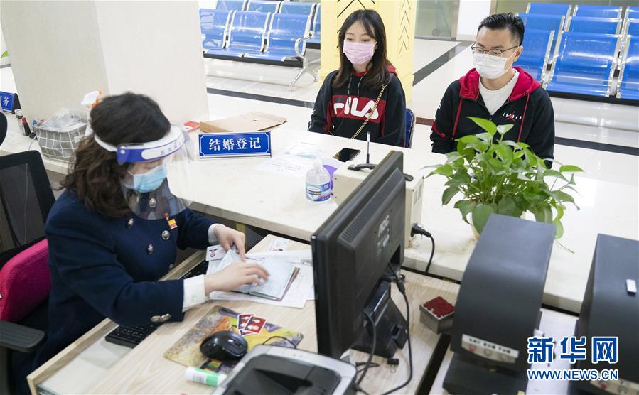 4月7日,在武漢市江岸區(qū)民政局婚姻登記處,工作人員為新人陳先生與張女士辦理結(jié)婚登記手續(xù)。 新華社記者才揚攝