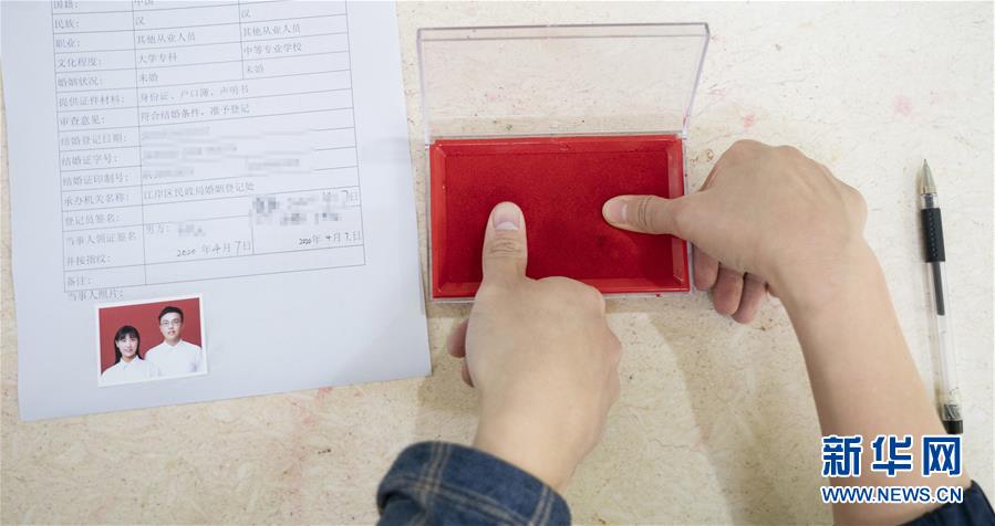 4月7日,在武漢市江岸區(qū)民政局婚姻登記處,新人辦理結(jié)婚手續(xù)時按手印。 新華社記者才揚攝
