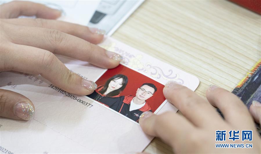 4月7日,在武漢市江岸區(qū)民政局婚姻登記處,新人盧先生和丁女士展示結(jié)婚證。 新華社記者才揚攝