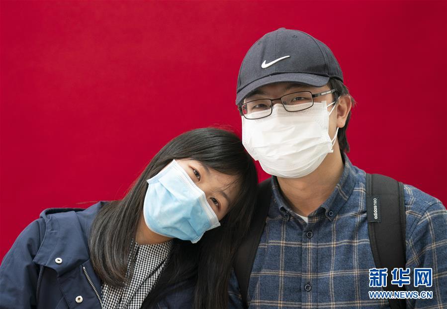 4月7日,在武漢市江岸區(qū)民政局婚姻登記處,陳先生與張女士隔著口罩親吻。 新華社記者才揚攝