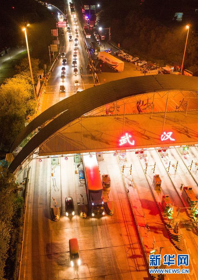 4月8日凌晨,車輛通過武漢北高速收費(fèi)站(無(wú)人機(jī)照片)。 新華社記者 肖藝九 攝