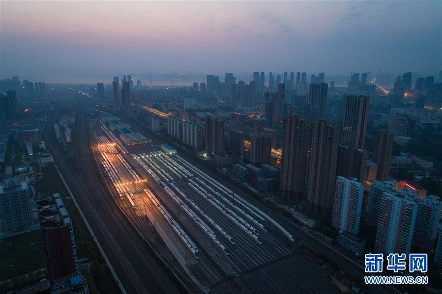 4月8日,在武漢動車段,列車??吭诖孳嚲€上準備投入運行(無人機照片)。 新華社記者 肖藝九 攝