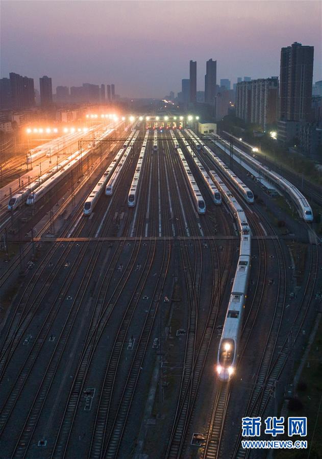 4月8日,一列動(dòng)車從武漢動(dòng)車段駛出,開往漢口站迎接旅客(無(wú)人機(jī)照片)。 新華社記者 肖藝九 攝