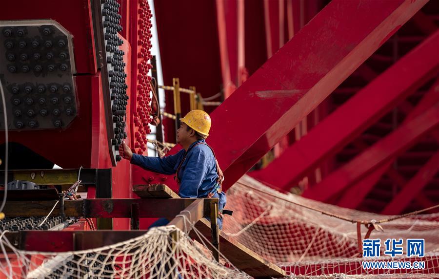 4月8日,來自湖北鄂州的中鐵四局工人熊學(xué)良進(jìn)行鋼桁梁架設(shè)作業(yè)。新華社記者江文耀攝