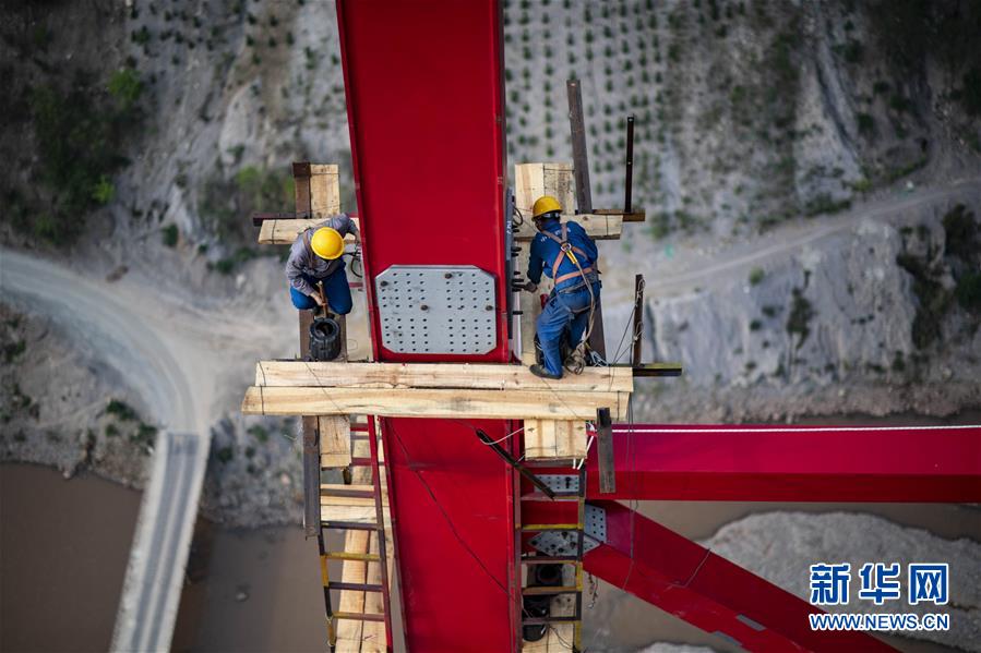 4月8日,兩名中鐵四局職工安裝架設(shè)鋼桁梁,每節(jié)鋼桁梁間的精度需要達(dá)到毫米級(jí)才能保證安裝到位。新華社記者江文耀攝