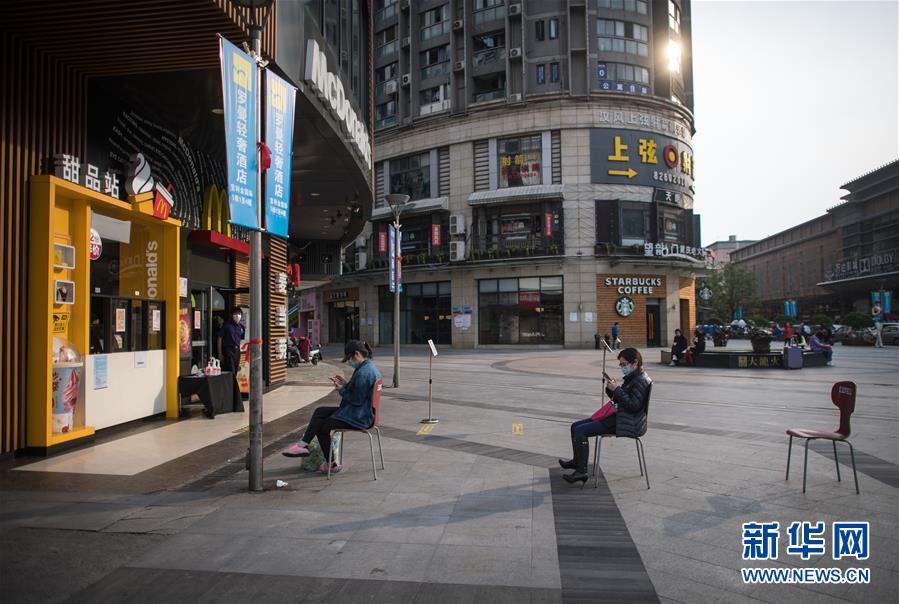 4月8日,顧客在江漢路步行街一家甜品店門(mén)前排隊(duì)。新華社記者肖藝九攝