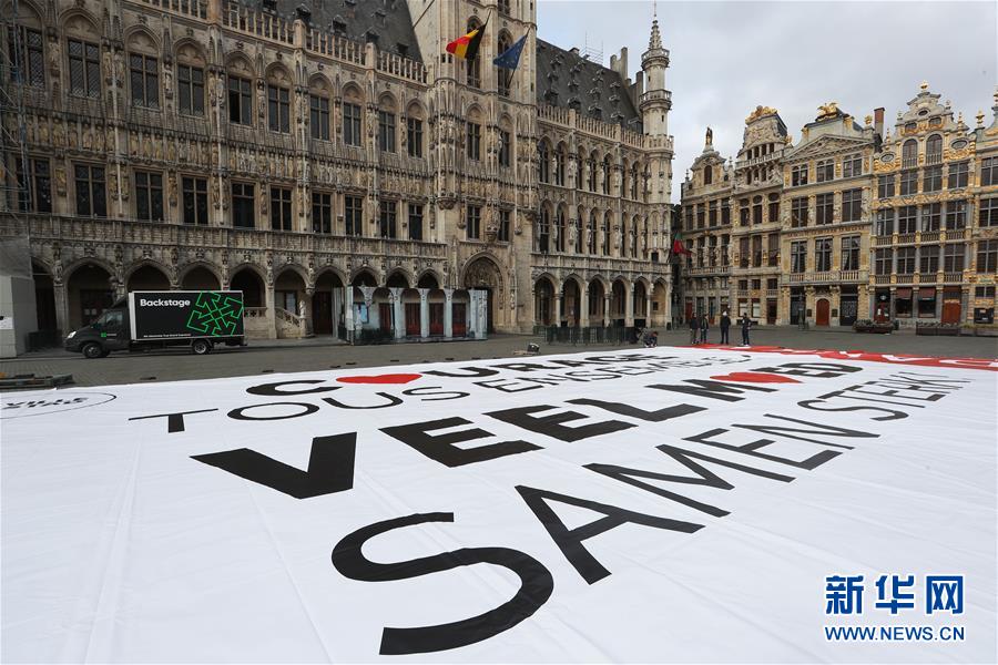 這是4月13日在比利時(shí)布魯塞爾大廣場(chǎng)拍攝的為抗擊疫情加油的巨幅海報(bào)。當(dāng)日,比利時(shí)布魯塞爾市政府工作人員在市中心的大廣場(chǎng)展開一面巨幅海報(bào),上面用法語和荷蘭語印著“一起鼓起勇氣”“謝謝”,以感謝市民及醫(yī)療人員為抗擊疫情所做的努力。新華社記者鄭煥松攝