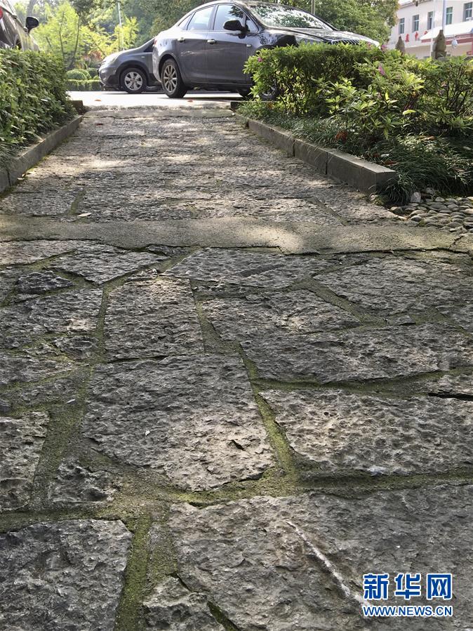 這是4月9日在張家界市區(qū)一路面拍攝的遠(yuǎn)古海洋生物化石地板。新華社記者蘇曉洲攝