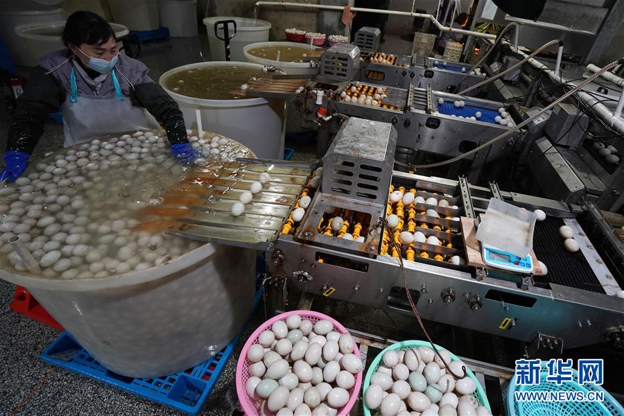 4月15日,在江蘇高郵鴨集團(tuán),工人在生產(chǎn)線上忙碌?!案哙]鴨蛋”是江蘇高郵的特色農(nóng)業(yè)名片。近年來,當(dāng)?shù)卦诹挤N繁育、生態(tài)養(yǎng)殖、產(chǎn)品加工等方面加大力度,推動(dòng)高郵鴨蛋品牌化建設(shè),讓小鴨蛋成為帶動(dòng)農(nóng)戶致富的大產(chǎn)業(yè)。2019年,高郵市共計(jì)生產(chǎn)熟制鴨蛋產(chǎn)品近11.2億枚,年產(chǎn)值近17.68億元。新華社記者季春鵬攝