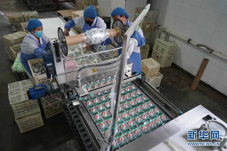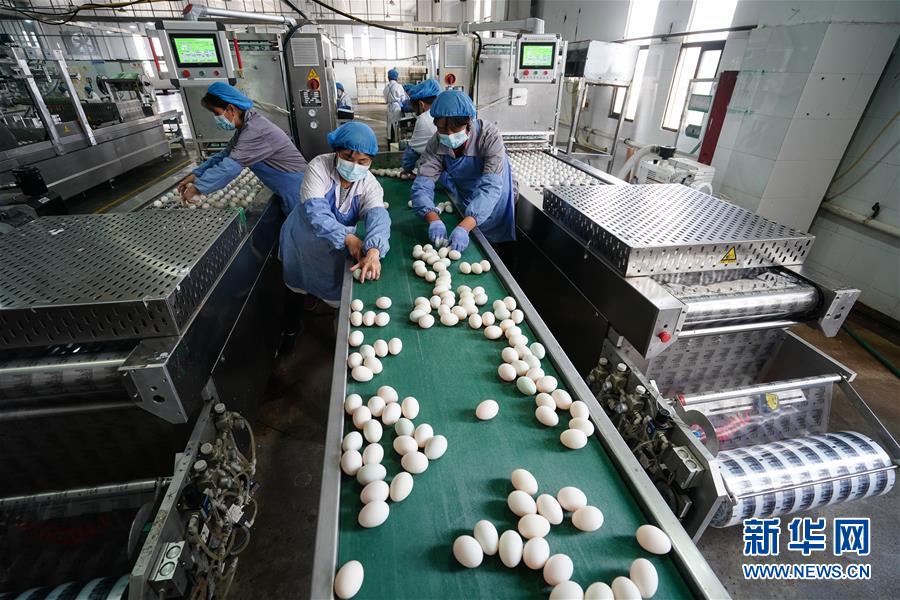 江蘇高郵鴨集團(tuán)的工作人員將塑封好的鴨蛋產(chǎn)品進(jìn)行進(jìn)一步加工作業(yè)(4月15日攝)。“高郵鴨蛋”是江蘇高郵的特色農(nóng)業(yè)名片。近年來,當(dāng)?shù)卦诹挤N繁育、生態(tài)養(yǎng)殖、產(chǎn)品加工等方面加大力度,推動(dòng)高郵鴨蛋品牌化建設(shè),讓小鴨蛋成為帶動(dòng)農(nóng)戶致富的大產(chǎn)業(yè)。2019年,高郵市共計(jì)生產(chǎn)熟制鴨蛋產(chǎn)品近11.2億枚,年產(chǎn)值近17.68億元。新華社記者李博攝