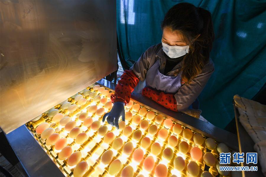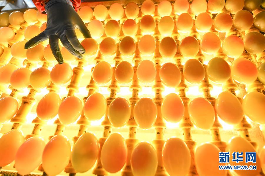 江蘇高郵鴨集團(tuán)的工作人員在生產(chǎn)線上對(duì)鴨蛋進(jìn)行光檢作業(yè)(4月15日攝)?!案哙]鴨蛋”是江蘇高郵的特色農(nóng)業(yè)名片。近年來,當(dāng)?shù)卦诹挤N繁育、生態(tài)養(yǎng)殖、產(chǎn)品加工等方面加大力度,推動(dòng)高郵鴨蛋品牌化建設(shè),讓小鴨蛋成為帶動(dòng)農(nóng)戶致富的大產(chǎn)業(yè)。2019年,高郵市共計(jì)生產(chǎn)熟制鴨蛋產(chǎn)品近11.2億枚,年產(chǎn)值近17.68億元。新華社記者李博攝