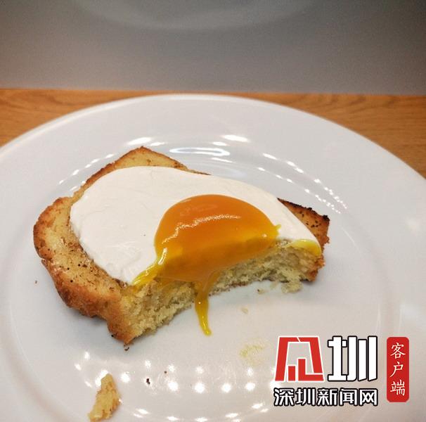 看起來像是土司蛋糕上的荷包蛋。但其實是烤檸檬海綿蛋糕,香草奶油制作的蛋清以及芒果泥制作的蛋黃。