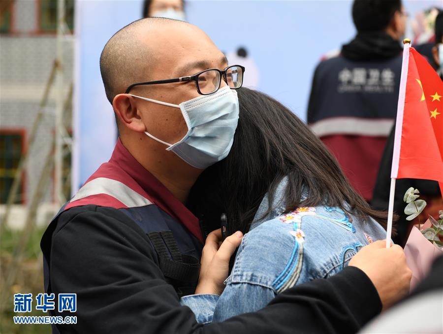 4月21日,在四川大學(xué)華西醫(yī)院,醫(yī)療隊(duì)隊(duì)員接受男友的捧花。當(dāng)日,來(lái)自四川大學(xué)華西醫(yī)院、華西第二醫(yī)院、華西第四醫(yī)院的醫(yī)療隊(duì)隊(duì)員解除隔離休整,與分別許久的家人、同事團(tuán)聚,緊緊相擁。新華社記者王曦?cái)z