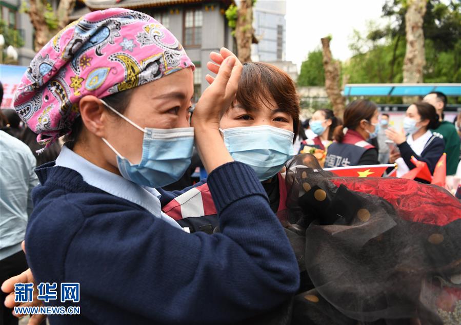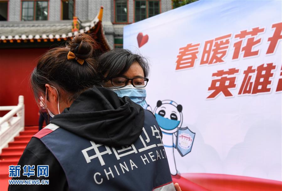 4月21日,在四川大學(xué)華西醫(yī)院,醫(yī)療隊(duì)隊(duì)員相互擁抱。當(dāng)日,來(lái)自四川大學(xué)華西醫(yī)院、華西第二醫(yī)院、華西第四醫(yī)院的醫(yī)療隊(duì)隊(duì)員解除隔離休整,與分別許久的家人、同事團(tuán)聚,緊緊相擁。新華社記者王曦?cái)z